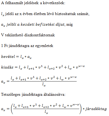 A jelenben történik meg a befizetés, melynek összege megegyezik a szerződést kötő ügyfelek és az általuk befizetett díj szorzatával. Ezután ezt az összeget váltak át életjáradékká. Ez a következő képen történik: minden még élő ügyfélnek kifizetnek egy fejenként fix összeget. Az idő előrehaladtával egyre kevesebb fő számára teljesít kifizetést a biztosító, így összértékben is csökken a biztosító kifizetése. A kifizetések és a bevételek összegének meg kell egyeznie (itt egyszerűsítésként feltételeztük, hogy a biztosító nem realizál profitot), így egy könnyen megoldható egyenlethez jutunk, melyből kiszámolhatjuk, hogy egy adott összegű jövedelmet, milyen életjáradékra válthatunk át, megfordítva a feltételezést a szükséges évi járadékból kiszámolhatjuk, hogy milyen összegű megtakarításra van szükségünk. Most pedig lássuk mindezt matematikailag felírva.