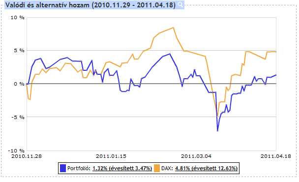 A német tőzsde esetében egy kimondottan konzervatív portfóliót igyekeztünk összeállítani öt világméretű vállalat részvényéből. A cél az volt, hogy egy stabil, a DAX-al szorosan együtt mozgó befektetést valósítsunk meg, mely képes lehet az index megverésére. Háromból két akadályt sikerrel vettünk, ugyanis egy a DAX-al igen erős korrelációt mutató, de annál stabilabb és egyúttal kisebb kockázatú portfóliót sikerült összerakni, ami nyereséges is lett , de nem volt képes megverni az indexet. A portfólión elért nyereség 1,32% (évesítve 3,47%) szemben a DAX 4,81%-os emelkedésével, melynek évesített értéke 12,63%. annak hátterében, hogy nem sikerült a benchmarkot felülteljesíteni elsősorban a Lufthansa és a METRO vártnál gyengébb teljesítménye áll.