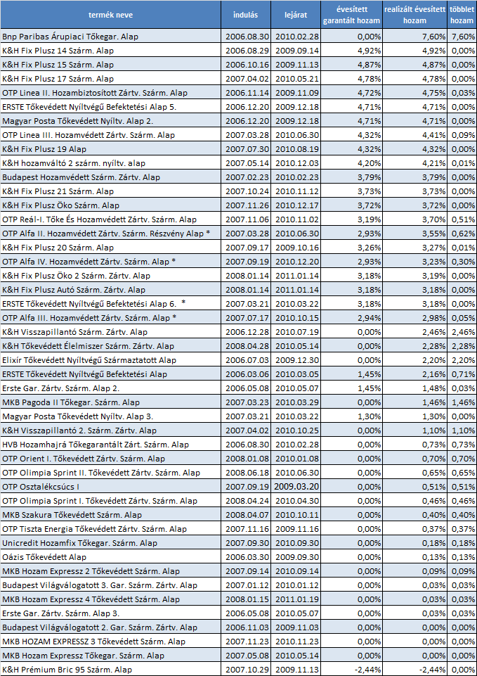 A következő táblázat összefoglaló jelleggel tartalmazza a vizsgált alapokat és azok múltbeli teljesítményét a ténylegesen realizált hozamok szerint rendezve. Csillaggal jelöltük azokat az alapokat, amelyeknél történt a lejárat előtti kifizetés. Ezek számszerűsítésénél a pénz időértékét nem vettük figyelembe, ezért kalkulációnk enyhén lefelé torzítja a ténylegesen elért hozamot.