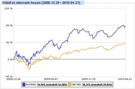 A 2009 októberében ajánlott portfólió teljesítményét a következő linken lehet követni. Látható, hogy összességében felülteljesítette a benchmarkot, a portfóliónak voltak kiemelkedően jó, és valamivel gyengébb periódusai. A China Sky One Medical árfolyama például több mint 100%-kal emelkedett az ajánlás után két hónappal, onnan csorgott vissza. Hasonló volt a helyzet a Continucare-rel is, melynek árfolyama először 90%-ot emelkedett, majd csökkenni kezdett, de még így is jóval az index fölött teljesített.